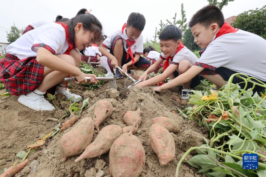 9月1日,浙江省湖州市德清縣雷甸鎮(zhèn)中心小學學生在校園農(nóng)場挖番薯。