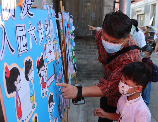北京市第一幼兒園將疫情防控作為開學(xué)第一課的主題,帶領(lǐng)孩子們積極參與到防疫兒歌互動(dòng)游戲中,還通過(guò)趣味體育運(yùn)動(dòng)、觀看防疫主題展板等,在邊看邊玩邊做的過(guò)程中了解防疫知識(shí),增強(qiáng)防疫意識(shí)。