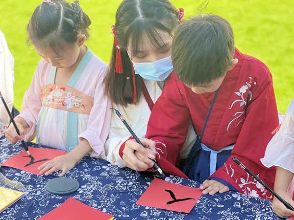 在春江幼兒園,小朋友們認(rèn)真地學(xué)寫人生中的第一個(gè)字——“人”。“人”字筆畫雖簡(jiǎn)單易學(xué),但卻象征著為人要心胸坦蕩、頂天立地的重要意義。“人”字完成后,孩子們拿起小鼓槌在“一鳴驚人,擊鼓增志”儀式環(huán)節(jié),鉚足勁兒擊鼓三聲,表明遠(yuǎn)大志向,為自己的人生鼓勁加油。