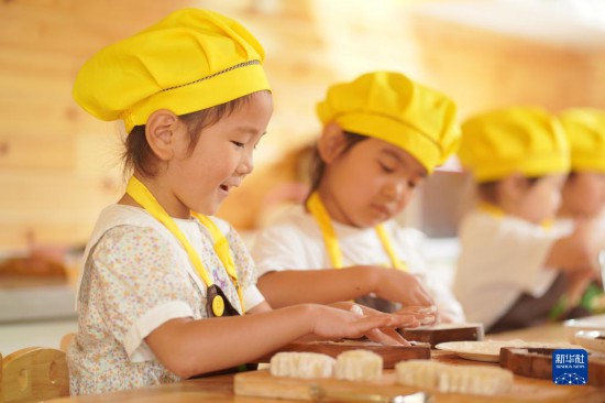 9月8日,河北省邢臺市內(nèi)丘縣第三幼兒園的小朋友在制作月餅。