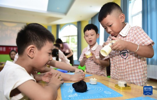 9月8日,河南省洛陽市河柴幼兒園的小朋友在體驗制作手工月餅。