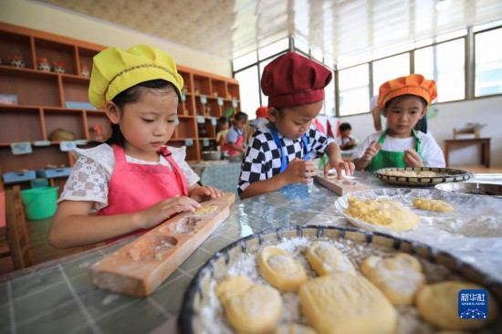 9月8日,貴州省黔東南苗族侗族自治州從江縣剛邊壯族鄉(xiāng)中心幼兒園的小朋友在學(xué)習(xí)制作月餅。