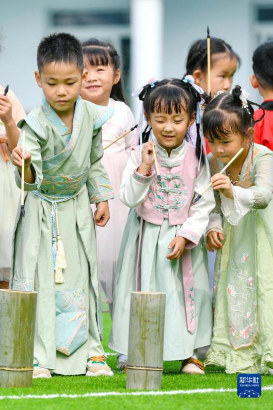 9月8日,浙江省湖州市長興縣煤山鎮(zhèn)中心幼兒園的小朋友在體驗投壺游戲。