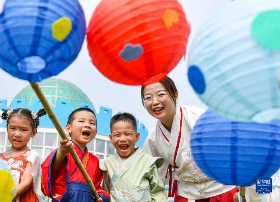9月8日,浙江省湖州市長(zhǎng)興縣煤山鎮(zhèn)中心幼兒園的師生一起進(jìn)行竹竿挑燈游戲。