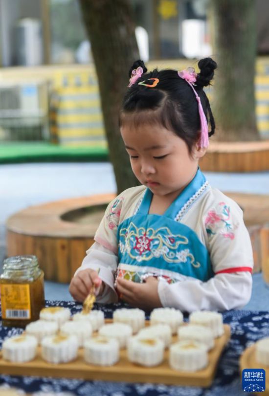 9月8日,長橋中心幼兒園的孩子們?cè)诶蠋煹膸ьI(lǐng)下自制桂花月餅。