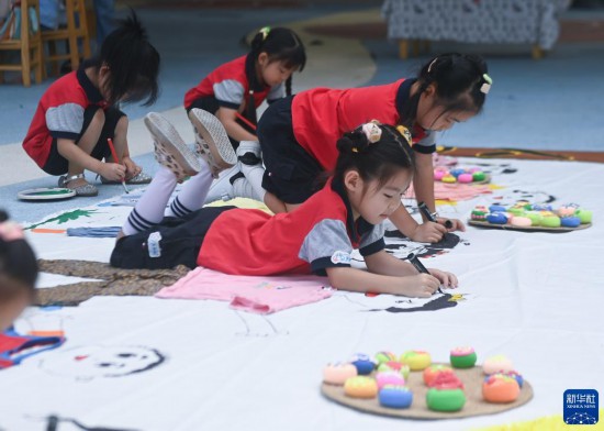 9月8日,長(zhǎng)橋中心幼兒園的孩子們?cè)诶蠋煹膸ьI(lǐng)下用廢舊衣物等創(chuàng)作“月圓人團(tuán)圓”環(huán)保創(chuàng)意畫。