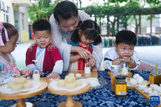 9月8日,長橋中心幼兒園的孩子們在老師的帶領(lǐng)下自制桂花月餅。
