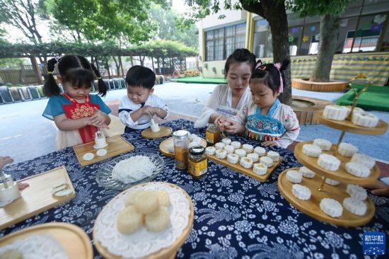 9月8日,長橋中心幼兒園的孩子們?cè)诶蠋煹膸ьI(lǐng)下自制桂花月餅。