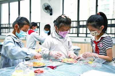 長沙市東郡第二小學學生在烘焙課上練習。新華社發(fā)