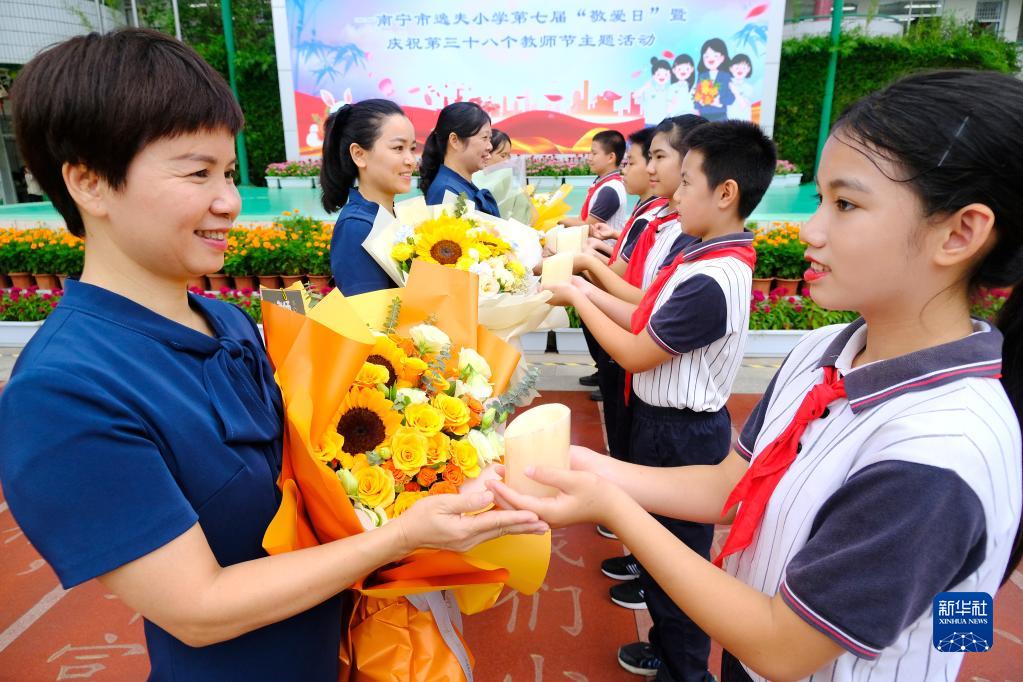9月9日,廣西南寧市逸夫小學(xué)的幾名學(xué)生代表向教師代表表達(dá)敬意。