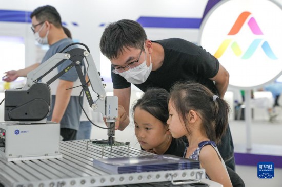 9月17日,在2022年全國大眾創(chuàng)業(yè)萬眾創(chuàng)新活動周合肥主會場的主題展區(qū),家長帶著孩子參觀智能協(xié)作機械臂。
