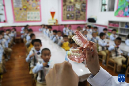 9月19日,在甘肅省定西市安定區(qū)友誼幼兒園,校醫(yī)為孩子們講授正確的刷牙方式。