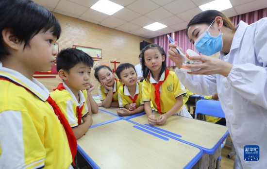 9月19日,在湖南省衡陽市雁峰區(qū)環(huán)城南路小學(xué),南華大學(xué)衡陽醫(yī)學(xué)院口腔專業(yè)的大學(xué)生志愿者在指導(dǎo)孩子們用正確的方式刷牙。