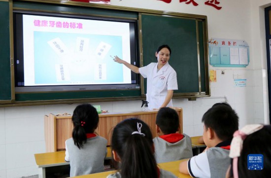 9月19日,河南省洛陽市汝陽縣疾控中心工作人員給縣外國語小學學生普及口腔健康知識。