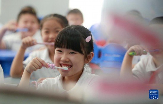 9月19日,在江蘇省揚(yáng)州市朱自清小學(xué),學(xué)生在老師指導(dǎo)下練習(xí)正確的刷牙方法。