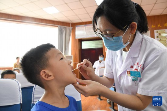 9月19日,在河南省濟(jì)源市濟(jì)水東園學(xué)校,濟(jì)源市人民醫(yī)院口腔科醫(yī)生為小學(xué)生檢查口腔健康狀況。