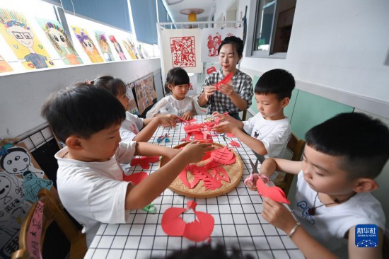 9月20日,老師指導(dǎo)孩子們剪出稻穗、蘿卜、青菜等農(nóng)作物的剪紙作品。