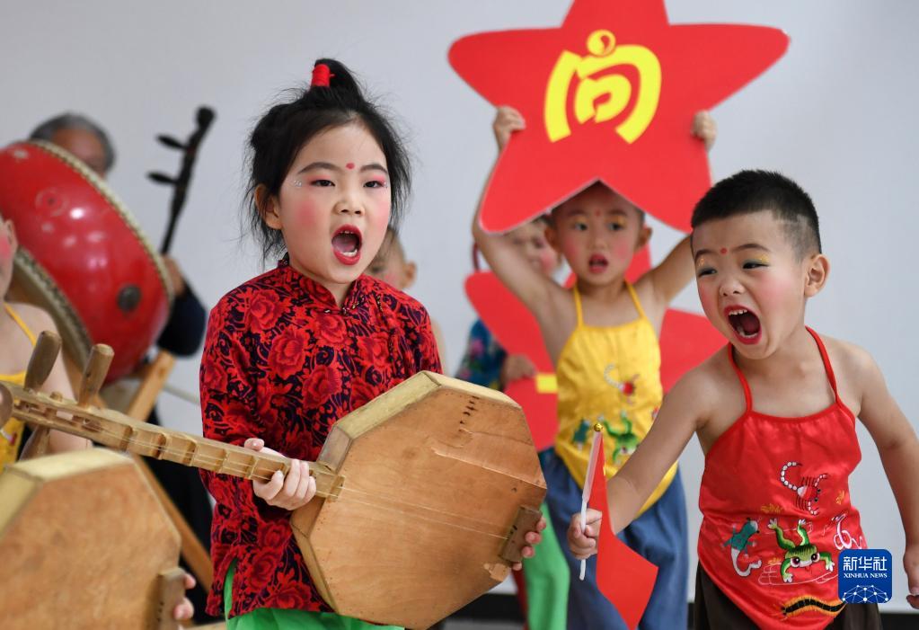 潼關(guān)縣城關(guān)北區(qū)幼兒園的孩子們表演“黃河老腔”(9月27日攝)。
