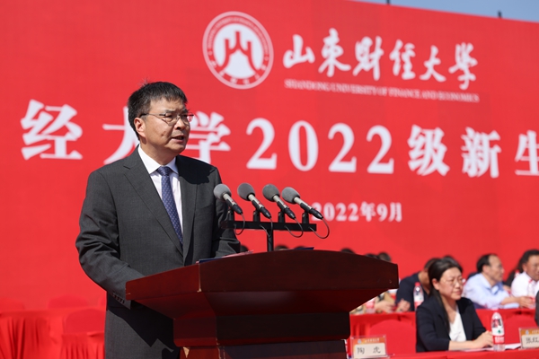 山東財(cái)經(jīng)大學(xué)校長趙忠秀在2022級新生開學(xué)典禮上講話。校方供圖