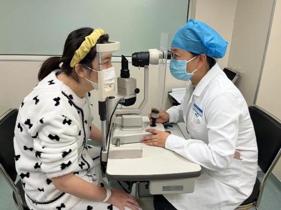 10月13日,青海省人民醫(yī)院眼科副主任醫(yī)師張曉英(右)在為患者做檢查。(受訪者供圖)