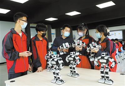 圖為在河北省石家莊市井陘縣職業(yè)技術(shù)教育中心,老師指導(dǎo)學(xué)生學(xué)習(xí)機(jī)器人相關(guān)知識(shí)。新華社記者 駱學(xué)峰攝