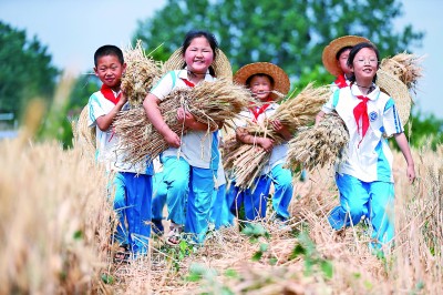 青島藍(lán)谷高新區(qū)東皋埠小學(xué)的學(xué)生在老師指導(dǎo)下收獲小麥。新華社發(fā)