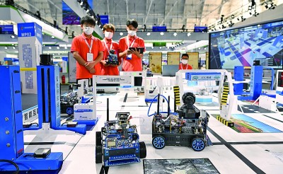 在天津舉行的世界職業(yè)技術(shù)教育發(fā)展大會(huì)首屆世界職業(yè)院校技能大賽上,參賽選手在實(shí)訓(xùn)沙盤(pán)前操作機(jī)器人設(shè)備。新華社發(fā)