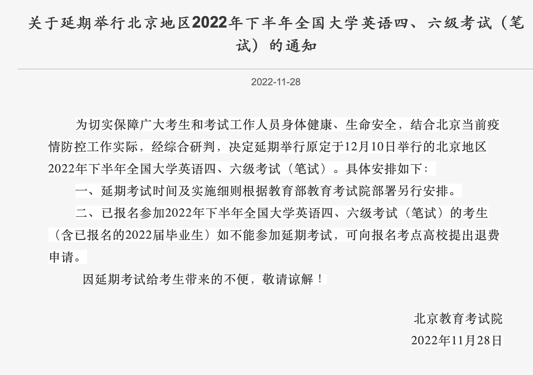 北京教育考試院通知指出,已報名參加2022年下半年全國大學(xué)英語四、六級考試(筆試)的考生(含已報名的2022屆畢業(yè)生)如不能參加延期考試,可向報名考點高校提出退費申請。