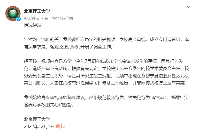 北京理工大學(xué)通報(bào)“學(xué)校教師方岱寧相關(guān)視頻”處理結(jié)果