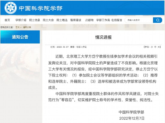 原標(biāo)題:中國科學(xué)院學(xué)部:停止北京理工大學(xué)方岱寧部分院士權(quán)利