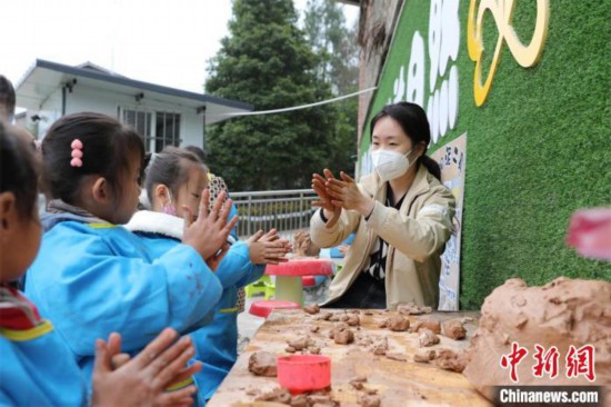 武勝縣賽馬鎮(zhèn)第二幼兒園老師教孩子們做泥塑!⊥趿 攝