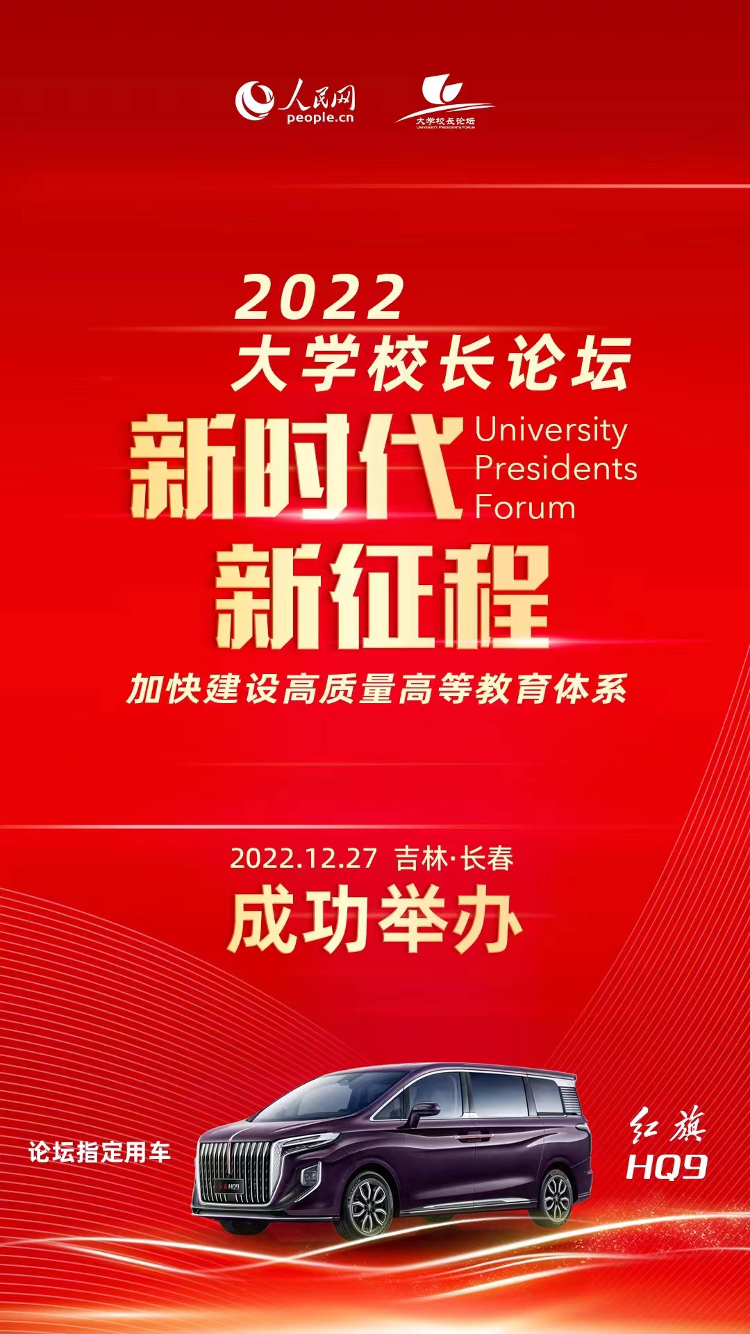 作為國家級大型年度教育論壇,人民網大學校長論壇已成功舉辦九屆,500余位大學書記、校長會聚一堂,共同為中國高等教育改革與發(fā)展建言獻策,在業(yè)界引起強烈反響。本屆論壇得到了多方大力支持,“紅旗HQ9”為本次論壇指定用車。