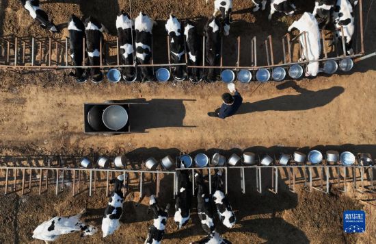 12月28日,程鵬飛在牛舍喂牛(無人機(jī)照片)。
