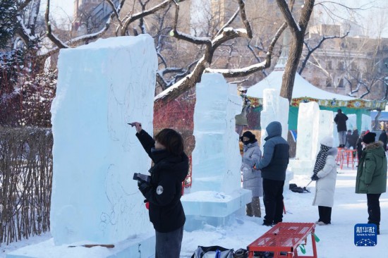 12月29日,參賽選手在進行冰雕創(chuàng)作。