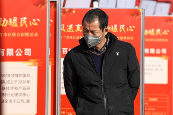 1月11日,2023年“創(chuàng)響江蘇”春風(fēng)行動(dòng)聯(lián)合招聘會(huì)在南京市浦口區(qū)舉行。圖為一名求職者在招聘會(huì)現(xiàn)場(chǎng)查看招聘信息。 新華社記者 李博 攝