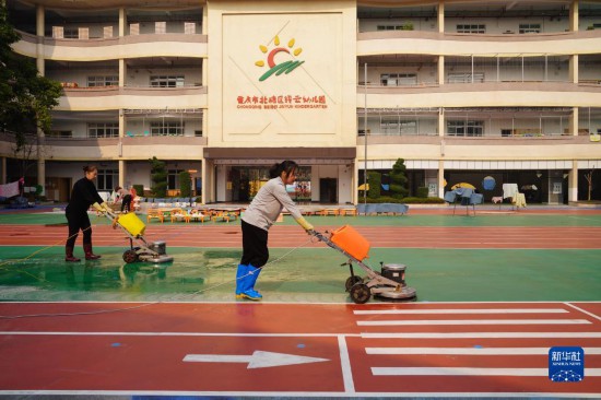 1月31日,在重慶市北碚區(qū)一家幼兒園,兩名工人在清洗校園地面。