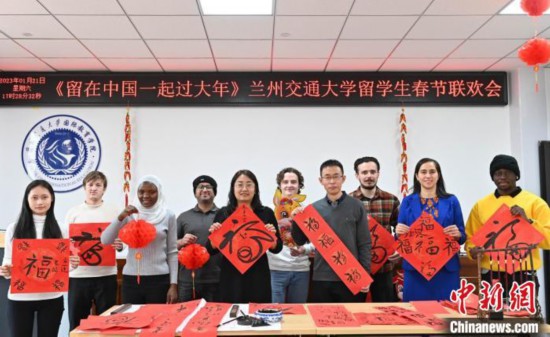 圖為蘭州交通大學(xué)外籍教師加漢(著藍(lán)色衣服者)和留學(xué)生一起寫春聯(lián)。 李亞龍 攝