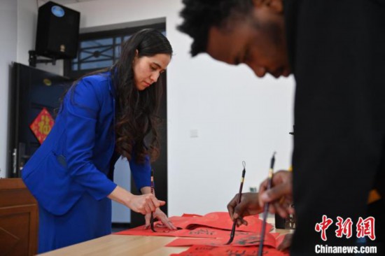 1月21日,農(nóng)歷除夕,蘭州交通大學(xué)留學(xué)生在校內(nèi)參加“留在中國(guó)一起過(guò)大年”春節(jié)聯(lián)歡會(huì),寫春聯(lián)、福字。 李亞龍 攝