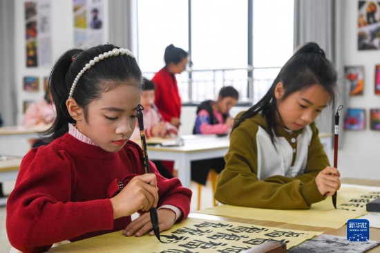 2月2日,在廣西興業(yè)縣至德小學,學生們在練習書法。