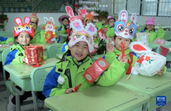 2月5日,合肥市夢園小學(xué)教育集團天柱路學(xué)校學(xué)生展示元宵節(jié)頭飾和手工作品。