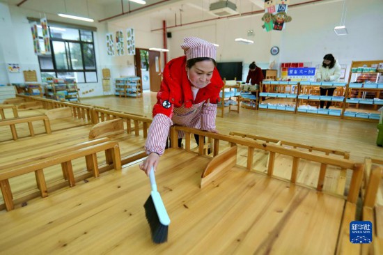 2月9日,福建武夷山百花幼兒園的老師們在清潔孩子們的寢具。