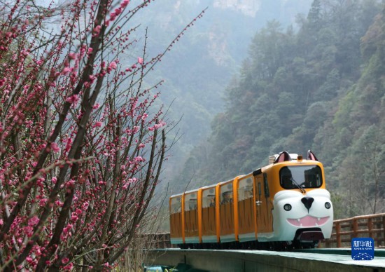 2月19日,游人乘坐十里畫廊觀光電車在湖南張家界國家森林公園游玩。