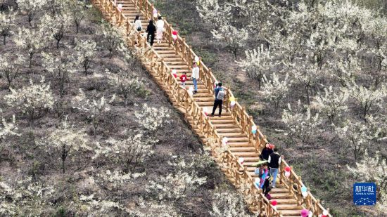 2月18日,游客在廣西柳州市鹿寨縣導(dǎo)江鄉(xiāng)山楂林中賞花休閑(無人機照片)。