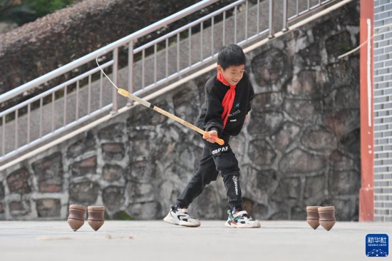 2月22日,廣西蒙山縣夏宜民族學(xué)校學(xué)生在體育課上打陀螺。