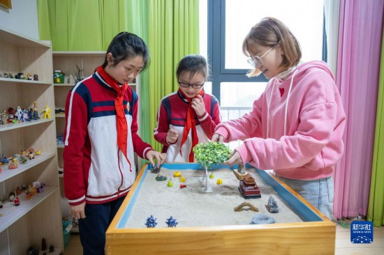 3月22日,寧波市江北區(qū)洪塘實(shí)驗(yàn)學(xué)校的心理教師在心理輔導(dǎo)室陪學(xué)生一起擺放沙盤。