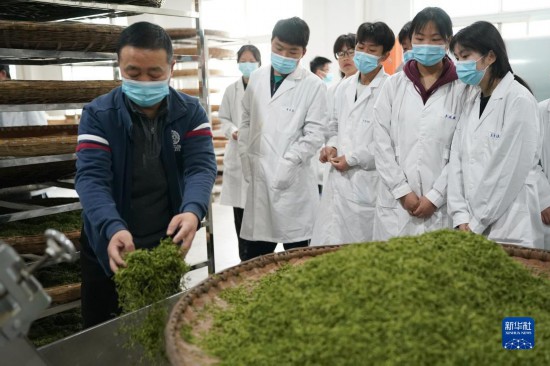3月29日,紫陽縣職業(yè)教育中心茶葉專業(yè)的學(xué)生在該縣洄水鎮(zhèn)一家茶廠內(nèi)學(xué)習(xí)茶葉鮮葉的干燥工藝。