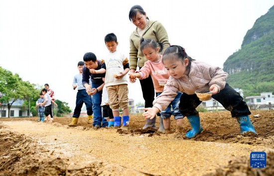 4月1日,在柳江區(qū)進德鎮(zhèn)龍新村龍朝屯,小朋友在家長陪同下學(xué)習(xí)播撒稻種。