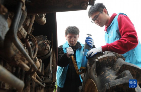 4月29日,在衡陽縣西渡鎮(zhèn)新橋村,南華大學(xué)的大學(xué)生志愿者在保養(yǎng)農(nóng)機。