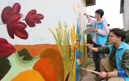 4月29日,在衡陽縣西渡鎮(zhèn)新橋村,南華大學的大學生志愿者在繪墻畫。
