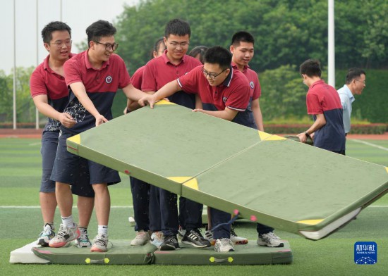 5月14日,在重慶市北碚區(qū)朝陽中學,高三學生參加“搭橋過河”趣味游戲。